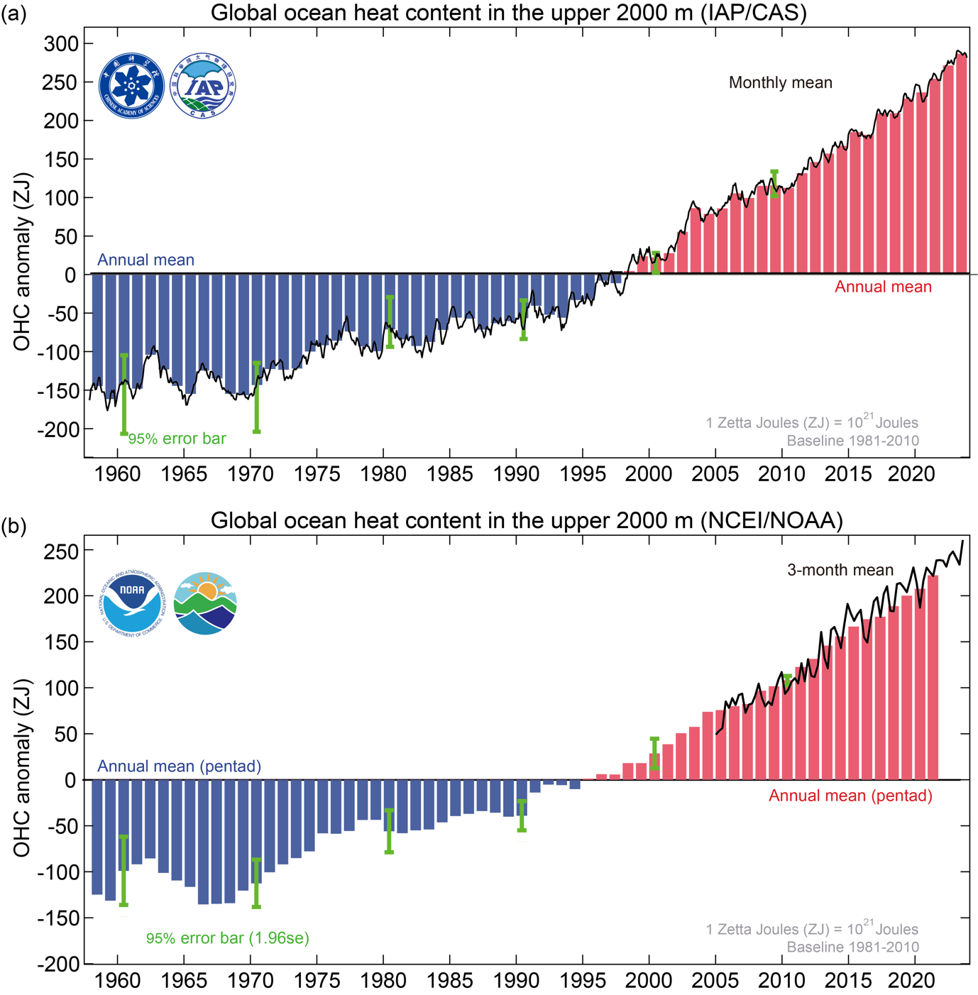 图2.1958至2023年全球海洋上层2000米热含量变化时间序列:上图为IAP/CAS数据、下图为NOAA/NCEI数据。