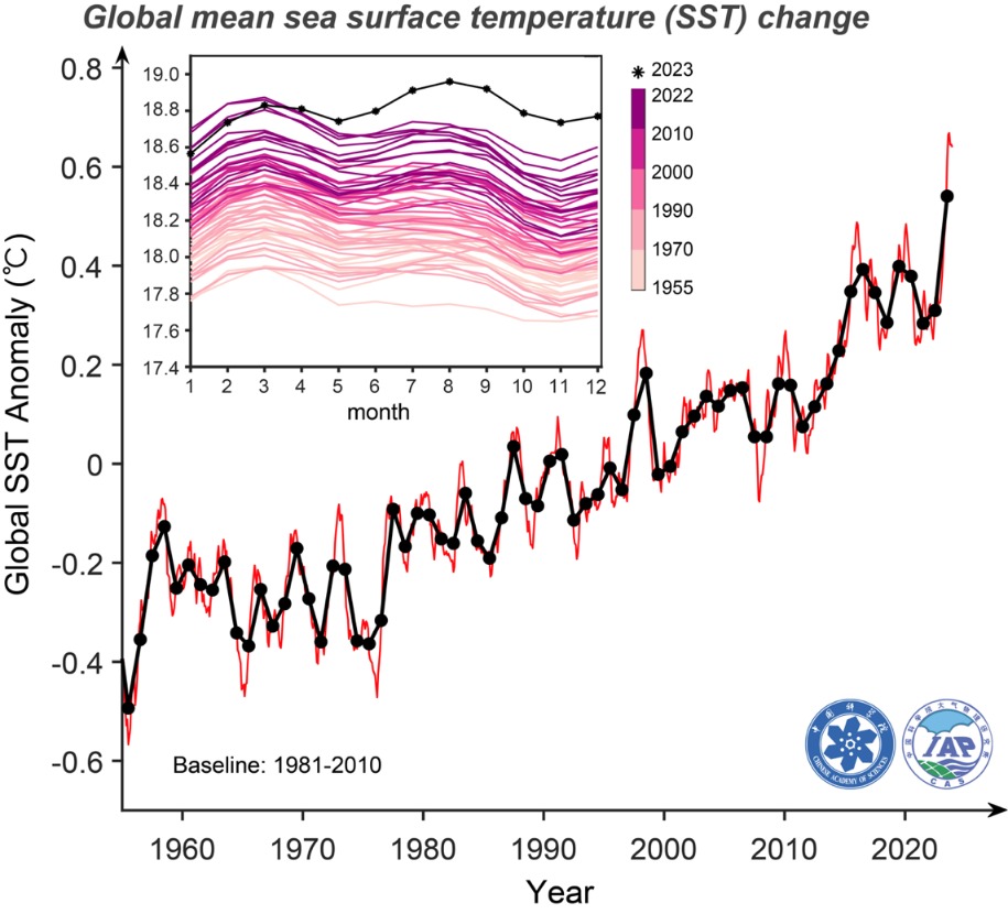 图3.根据IAP/CAS温度数据产品(1米层)分析的1955年至2023年12月全球平均海表温度变化。黑线为年均值,红色为月均值。异常值为相对于1981-2010年常年值。左上角内框为海表温度的季节变化。