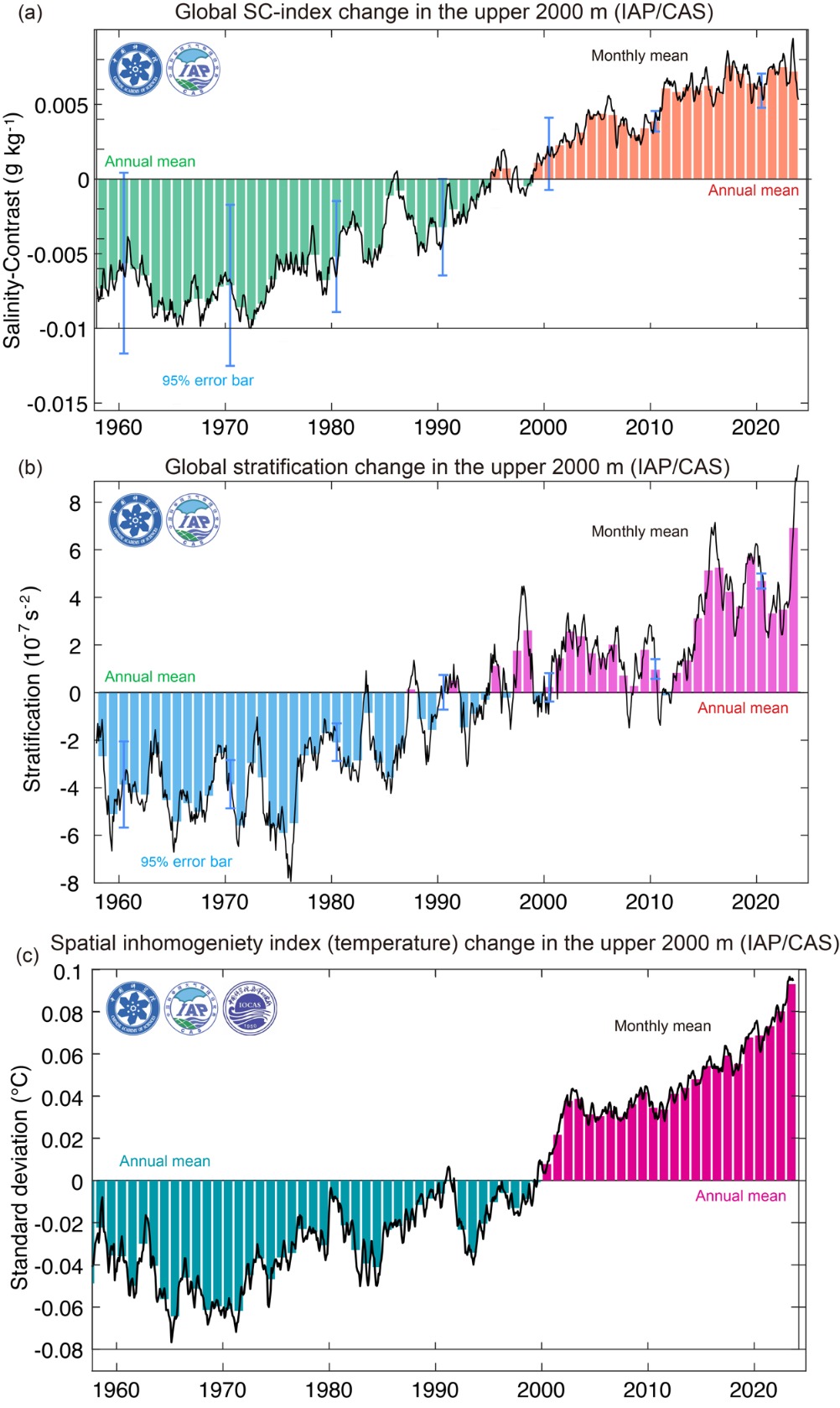 图4.1958-2023年全球海洋上层2000米盐度差指数SC(a)、层结(b)、温度空间非均匀性指数(c)变化时间序列。黑色线条为月度变化,条状色条为年变化。
