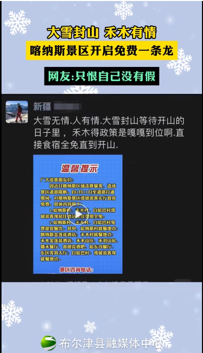 据澎湃新闻报道,1月13日布尔津县融媒体中心发布在其官方视频号发布《温馨提示》,称自1月11日至道路打通期间,对喀纳斯景区滞留旅客实行食宿免费。具体如下:1.喀纳斯村、禾木村、白哈巴村滞留旅客现居住酒店住宿费用全免;2.喀纳斯村、禾木村、白哈巴村免费提供餐饮,其中喀纳斯村就餐地点:喀纳斯金莲花酒店;禾木村就餐地点:禾木金莲花酒店、禾木山庄、禾羽山房、疆禾餐厅、普朗克酒吧、哈东玛餐厅、东区学具大厅;白哈巴村:滞留旅客现就餐地点。