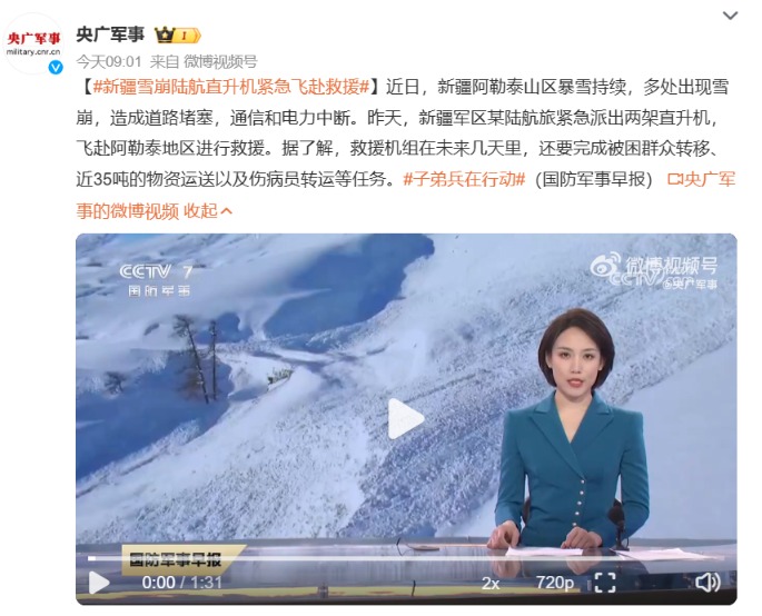 近日,新疆阿勒泰山区暴雪持续,多处出现雪崩,造成道路堵塞,通信和电力中断。据“央广军事”微博消息,昨天,新疆军区某陆航旅紧急派出两架直升机,飞赴阿勒泰地区进行救援。据了解,救援机组在未来几天里,还要完成被困群众转移、近35吨的物资运送以及伤病员转运等任务。